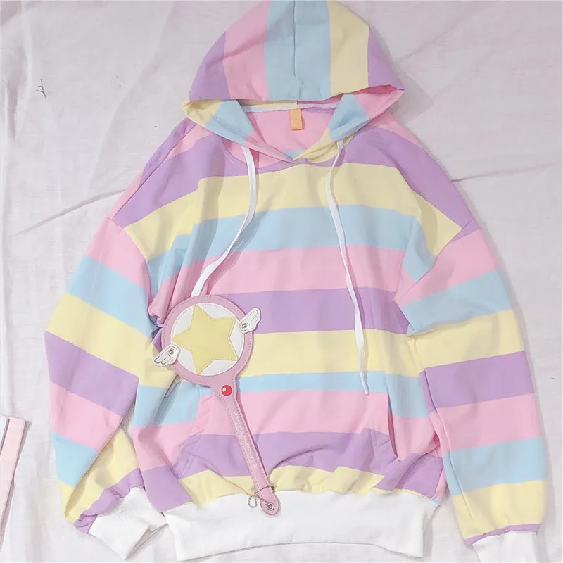 OVERVIEW Product Harajuku Rainbow Stripe Hoodies Women Sweatshirt Korean Style Matching Outfits Loose Pullover for S